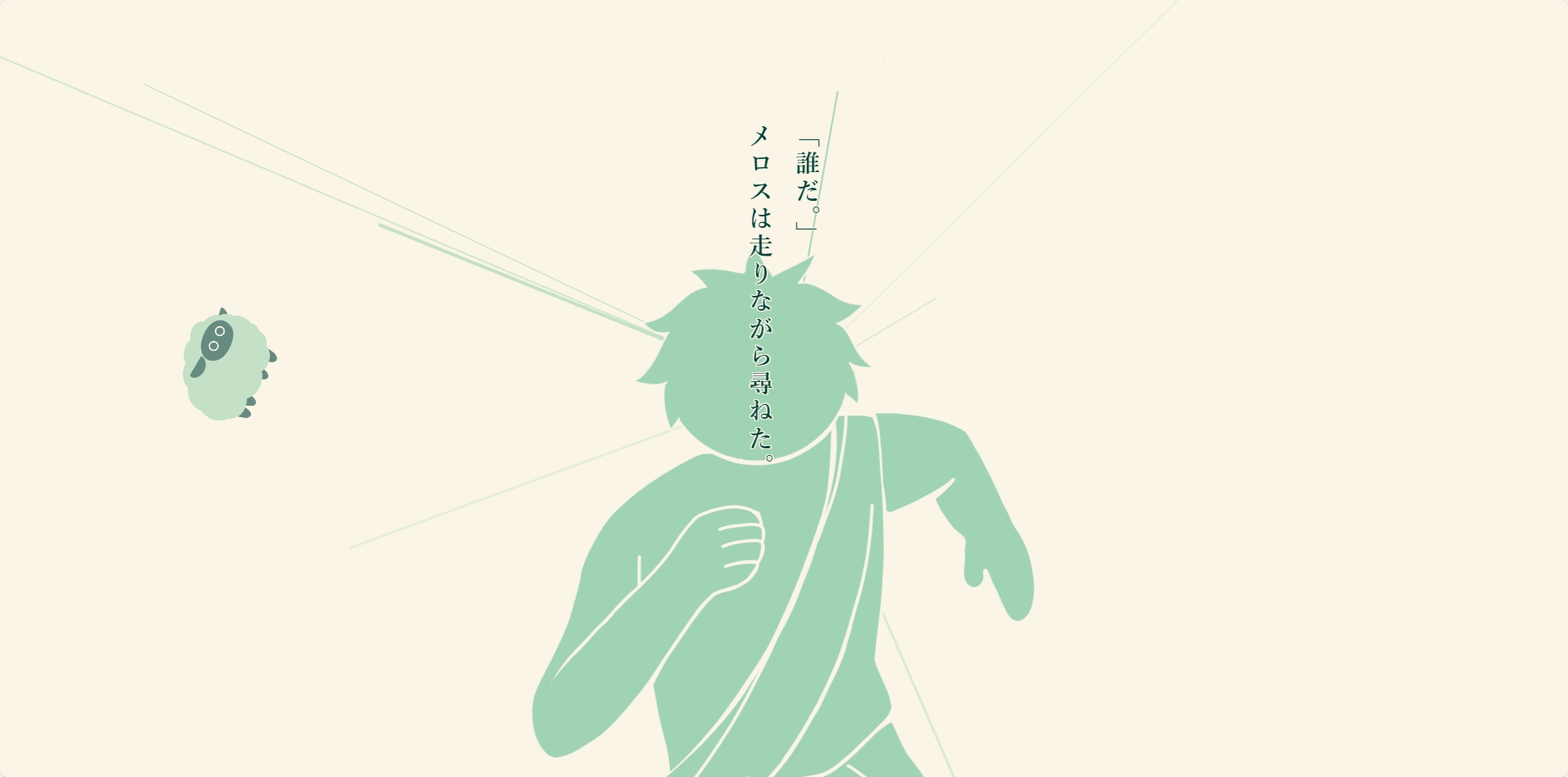 太宰治が書いた『走れメロス』のラストシーンを、スクロールテリングで読むことができる作品です。 『走れメロス』は、「メロスは激怒した。」から始まる冒頭が有名な小説です。 今回は、様々な困難を乗り越え、セリヌンティウスの元へ向かうラストシーンを、イラストやアニメーションを使用して制作しています。 冒頭は知っていても、ラストシーンはうろ覚え……という方もいらっしゃると思います。 そういった方にも楽しんでもらえる作品になっていると思います。 この作品は、スクロールによって話を進めることができます。 また、一部のシーンでは、タップ操作によってイラストを吹き飛ばすような、没入感を高める演出も用意しています。 ぜひ、お楽しみください!